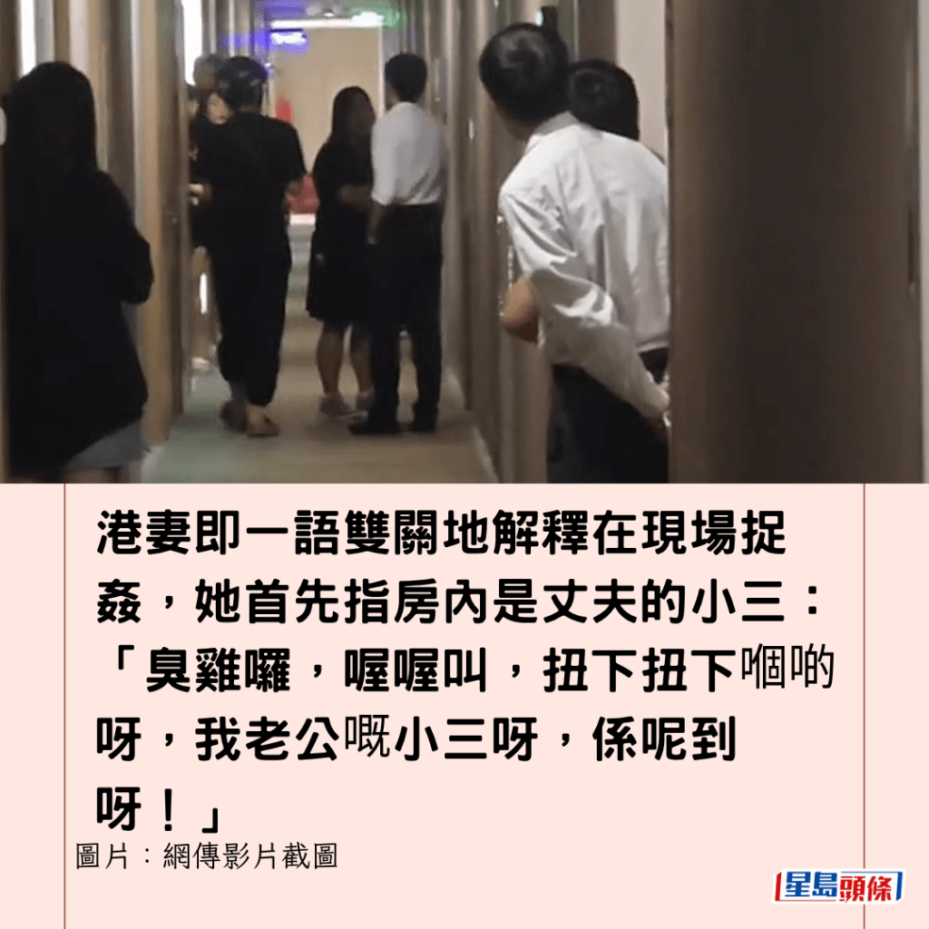 片中,現場懷疑有酒店職員或保安人員到場,並一度進入房內,人員向港妻了解情況,港妻即一語雙關地解釋在現場捉姦,她首先指房內是丈夫的小三:「臭雞囉,喔喔叫,扭下扭下嗰啲呀,我老公嘅小三呀,係呢到呀!」