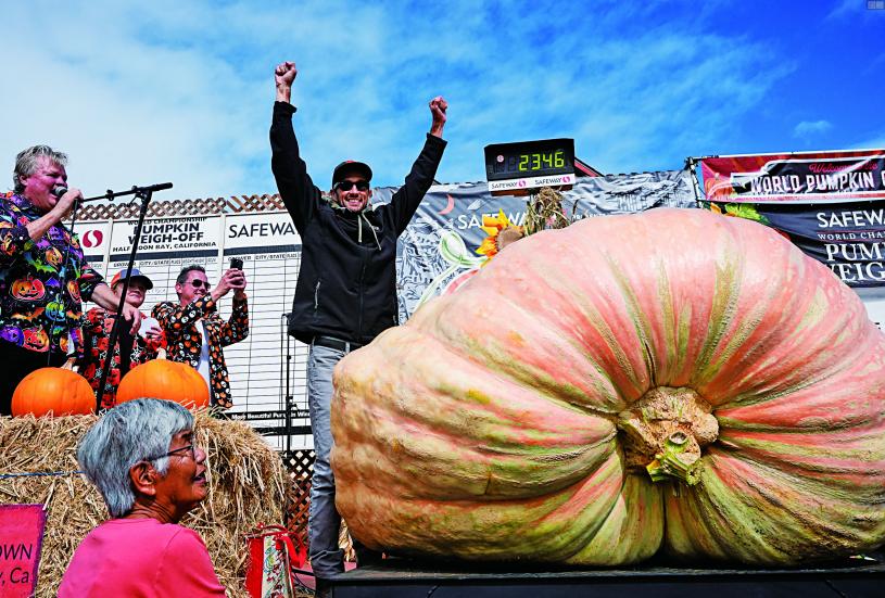 一位加州工程師兼園藝愛好者在北加州舉行的年度世界南瓜大賽中贏得了最高獎項。來自北灣聖他露莎(Santa Rosa)的道森(Brandon Dawson)在半月灣(Half Moon Bay 舉行的第52屆世界南瓜稱重錦標賽上奪冠。他的巨型南瓜重達2346磅,大約相當於一輛小型轎車或一頭大型野牛的重量。道森慶祝獲獎時,讓他的兩個孩子坐在巨型南瓜上,興奮揮舞手臂合影。他說,4歲的兒子現在會注意南瓜的生長過程,尤其是巨型南瓜每天可以長50到70磅。道森在電動汽車公司Rivian任職,已有五年的種植巨型南瓜經驗。圖為道森種植的大南瓜稱重2346磅,成功奪得今年大賽冠軍。圖與文:美聯社