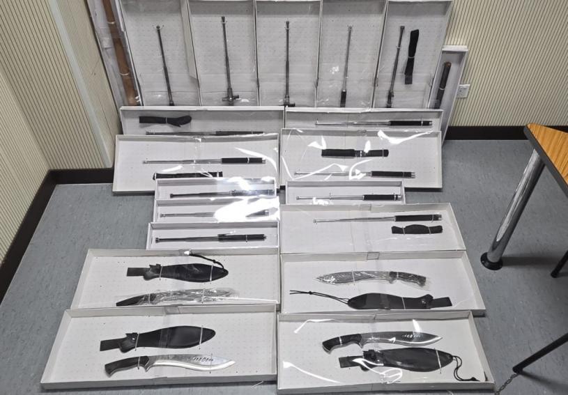 警方重申,藏有違禁武器及管有攻擊性武器均屬刑事罪行,根據香港法例第217章《武器條例》第4條,任何人管有違禁武器,即屬犯罪,一經定罪,可處罰款$10,000及監禁3年,而管有攻擊性武器,根據香港法例第228章 《簡易程序治罪條例》第17條,意圖將攻擊性武器作任何非法用途而管有,一經定罪,最高可罰款$5,000及監禁2年,市民切勿以身試法。