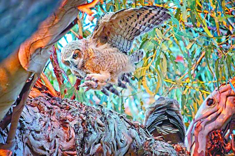 他告訴本報記者,常聽說在聖安東尼奧牧場每年有一窩大角貓頭鷹在一棵老齡的橡樹上築巢,終於有一天晚上他在現場用鏡頭捕捉到了小貓頭鷹振翅欲飛的生動情景。他說,在夜色中找到小貓頭鷹,並做好對焦、構圖、色彩等技術要素,都是挑戰。
