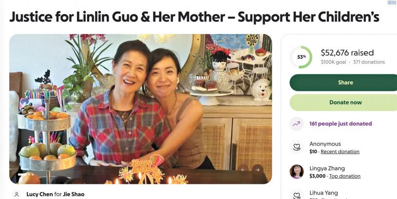 郭琳琳友人日前在募款網站GoFundMe上發起眾籌,善款將用於支付郭琳琳與母親的喪禮費用、雙胞胎姊妹的撫養權訴訟和兩人的生活與教育支出。
