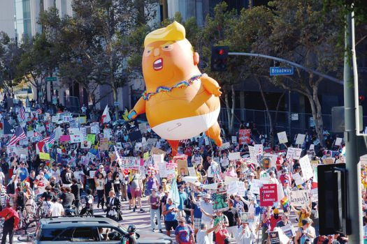洛杉磯街頭18日舉行「不要國王」示威。抗議人士拉著巨型充氣特朗普人像遊行。美聯社