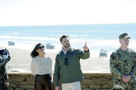 副總統萬斯與夫人烏莎18日在聖地牙哥縣潘德頓營觀賞海軍陸戰隊演示。美聯社
