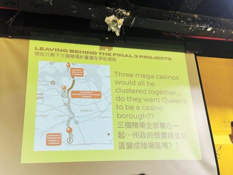 主持人用中英文為居民介紹賭場計劃的緣起和發展過程,指出:「目前競爭中的三個賭場地點相距僅數公里、車程不超過45分鐘,等於讓整個皇后區陷入『賭場包圍圈』。」她質問:「紐約其他地區都拒絕設立賭場,為什麼偏偏要讓皇后區成為賭場集中地?」