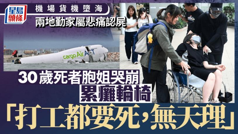 香港國際機場昨日(20日)發生嚴重事故,一架由迪拜抵港、載有4名機組人員的阿聯酋航空貨機UAE9788,於北跑道降落滑出海面。其間一輛機場保安有限公司的巡邏車被撞到後墮海,車上30歲姓陳航空安檢隊長和41歲姓何航空安檢督導同告死亡。今日(21日)早上,兩死者的家屬到葵涌殮房認屍,眾人傷心欲絕。其中陳的胞姐呼天搶地嚎哭,直指胞弟死得寃枉:「畀返個細佬我,打工都要死,無天理」,要求航空公司還家人一個公道。陳姊說到傷心處更一度暈厥,要坐輪椅離開。