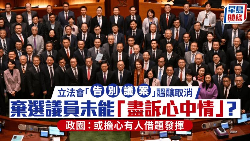本屆立法會會期將結束,本周三及四舉行最後一次大會,其中一個議程為「告別議案」,每名議員可發言5分鐘,「盡訴心中情」。不過,多名議員收到消息,「告別議案」正醞釀取消,原因之一是「提名期臨近,不希望有競逐連任的議員高調發言,形成不公平競爭」。內會主席李慧琼回覆《星島頭條》指,就告別議案,確實收到不同黨派議員意見,正綜合考慮和溝通中。