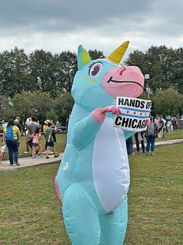10月18日,全美各地舉行「不要國王日」( No King Day )示威大遊行,此是繼今年6月舉行的「不要國王日」示威抗議遊行的多次行動。當天中午,在芝加哥市中心格蘭公園舉行的示威活動,以「 別碰芝加哥」( Hands off Chicago )作為抗議示威的主題,約有上萬的民眾手持不同訴求的海報聚集在格蘭公園的大草坪, 更有無數示威者打扮成充氣玩偶現身,增添了「趣味」。