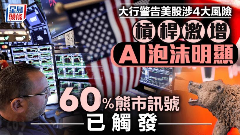 美股今年以來繼續亮麗,標指截至周二累升逾14%,納指更升近19%;不過,近期越來越多機構已作出警告,涉及四大風險。其中美銀指地區銀行危機引發的私貸市場問題一旦持續,將觸發退休基金等長期投資者拋售潮,並指美股估值貴、「已形成明顯泡沫」,更有60%熊市訊號已觸發。另一方面,德銀亦警告美股槓桿已升至科網泡沫和金融危機前夕水平。