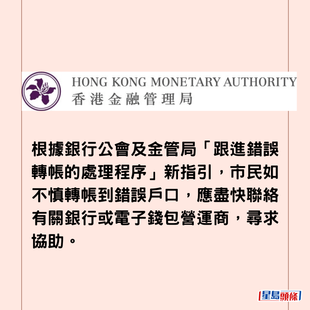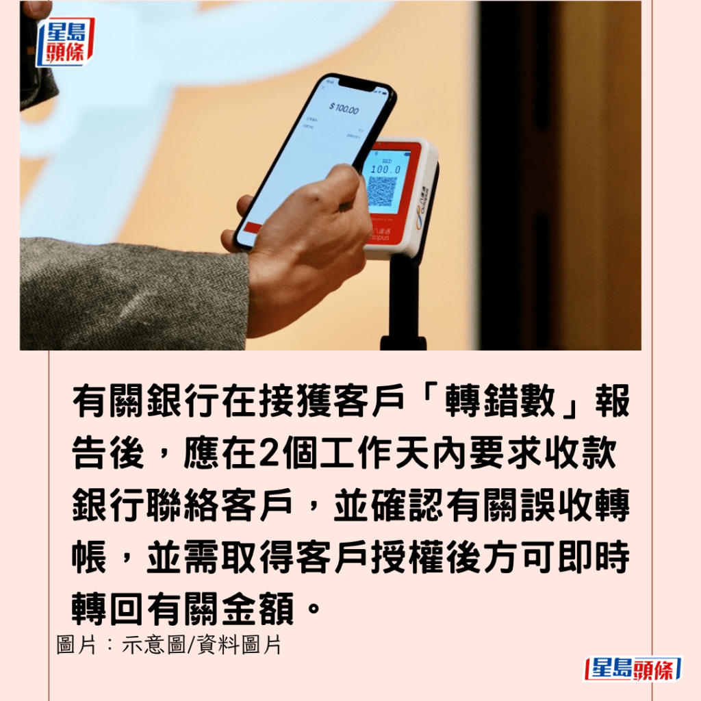 根據銀行公會及金管局「跟進錯誤轉帳的處理程序」新指引,市民如不慎轉帳到錯誤戶口,應盡快聯絡有關銀行或電子錢包營運商,尋求協助。有關銀行在接獲客戶「轉錯數」報告後,應在2個工作天內要求收款銀行聯絡客戶,並確認有關誤收轉帳,並需取得客戶授權後方可即時轉回有關金額。