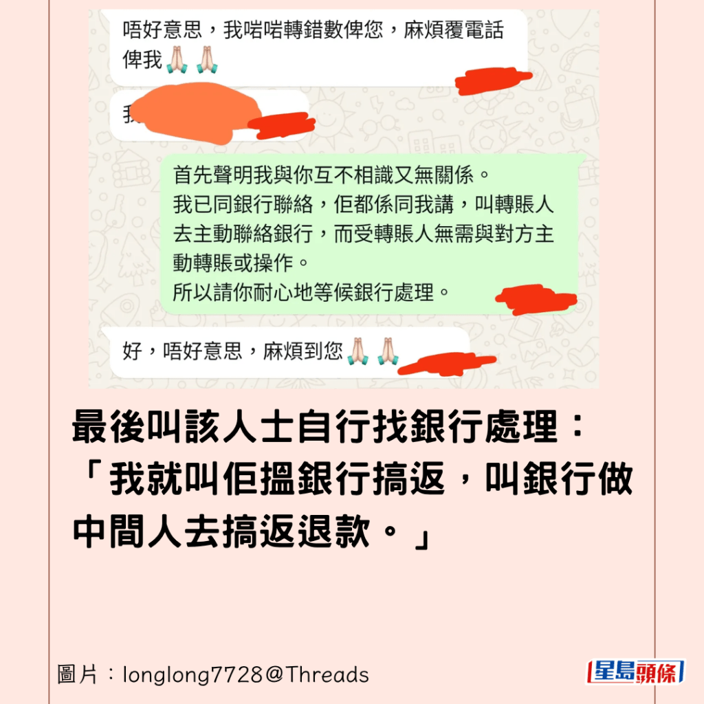 樓主交代後續處理方法,他指由於十萬元金額很大,他「真係唔敢郁」,最後叫該人士自行找銀行處理:「我就叫佢搵銀行搞返,叫銀行做中間人去搞返退款。」