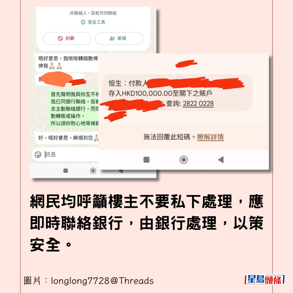 網民均呼籲樓主不要私下處理,應即時聯絡銀行,由銀行處理,以策安全。