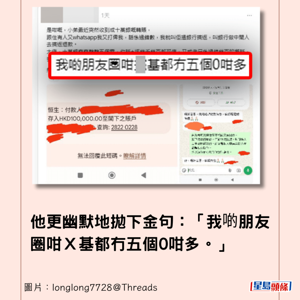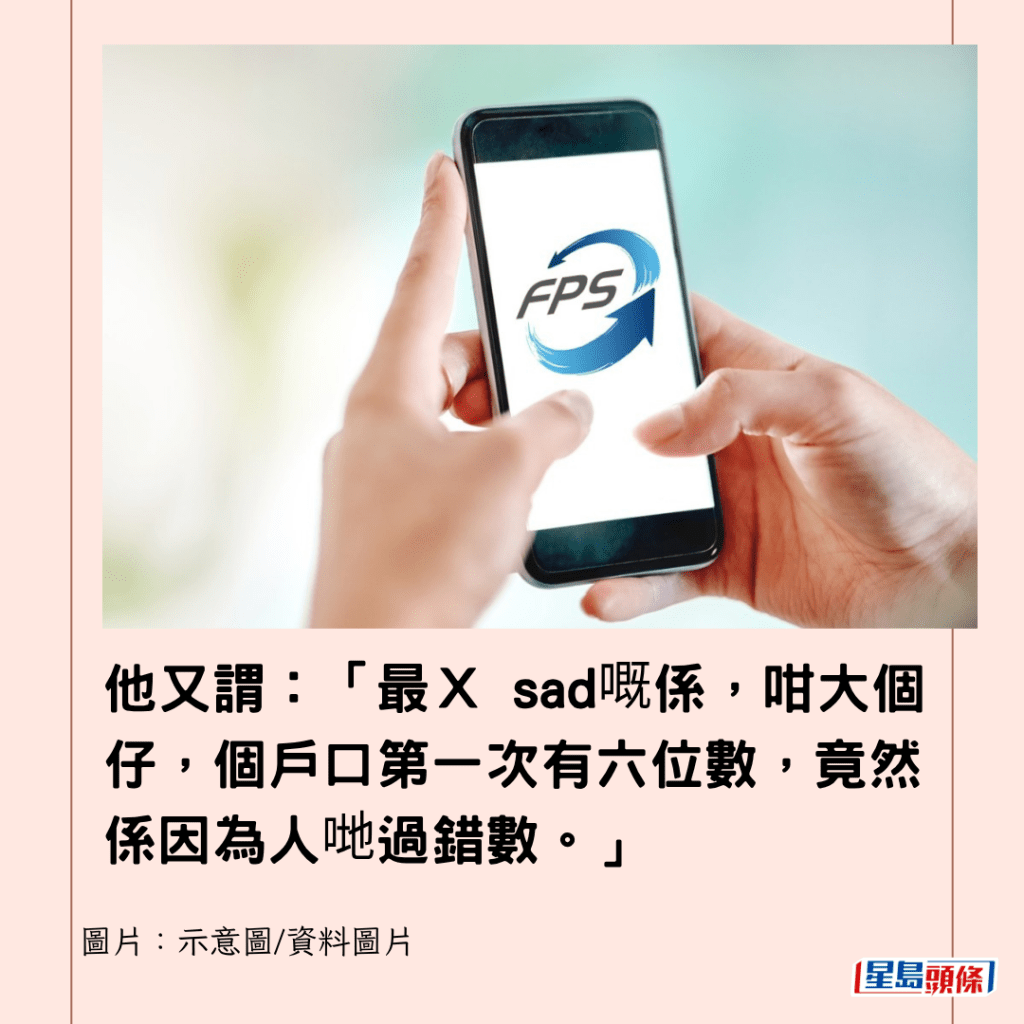 他更幽默地拋下金句:「我啲朋友圈咁X基都冇五個0咁多。」他又謂:「最X sad嘅係,咁大個仔,個戶口第一次有六位數,竟然係因為人哋過錯數。」