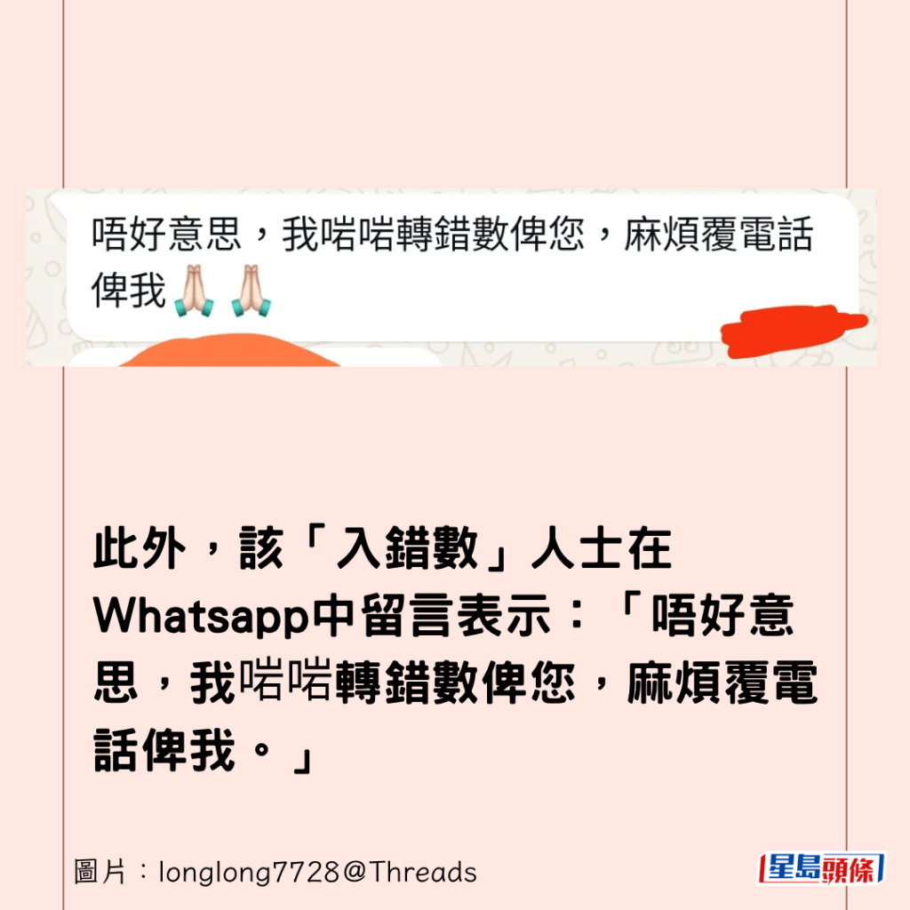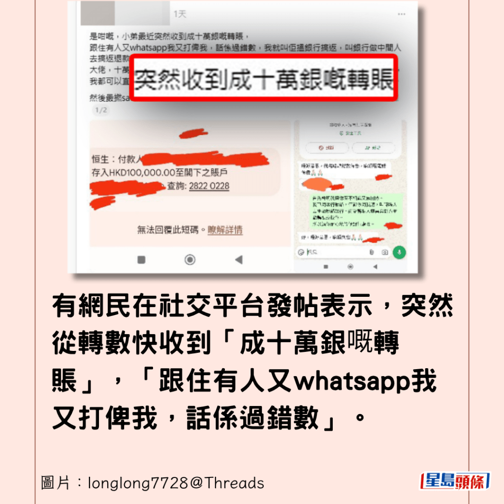 有網民昨(22日)在社交平台發帖表示,突然從轉數快收到「成十萬銀嘅轉賬」,「跟住有人又whatsapp我又打俾我,話係過錯數」。