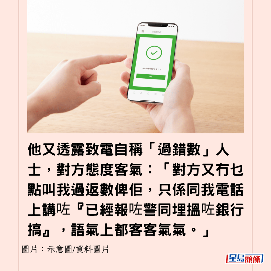 他又透露致電自稱「過錯數」人士,對方態度客氣:「對方又冇乜點叫我過返數俾佢,只係同我電話上講咗『已經報咗警同埋搵咗銀行搞』,語氣上都客客氣氣。」