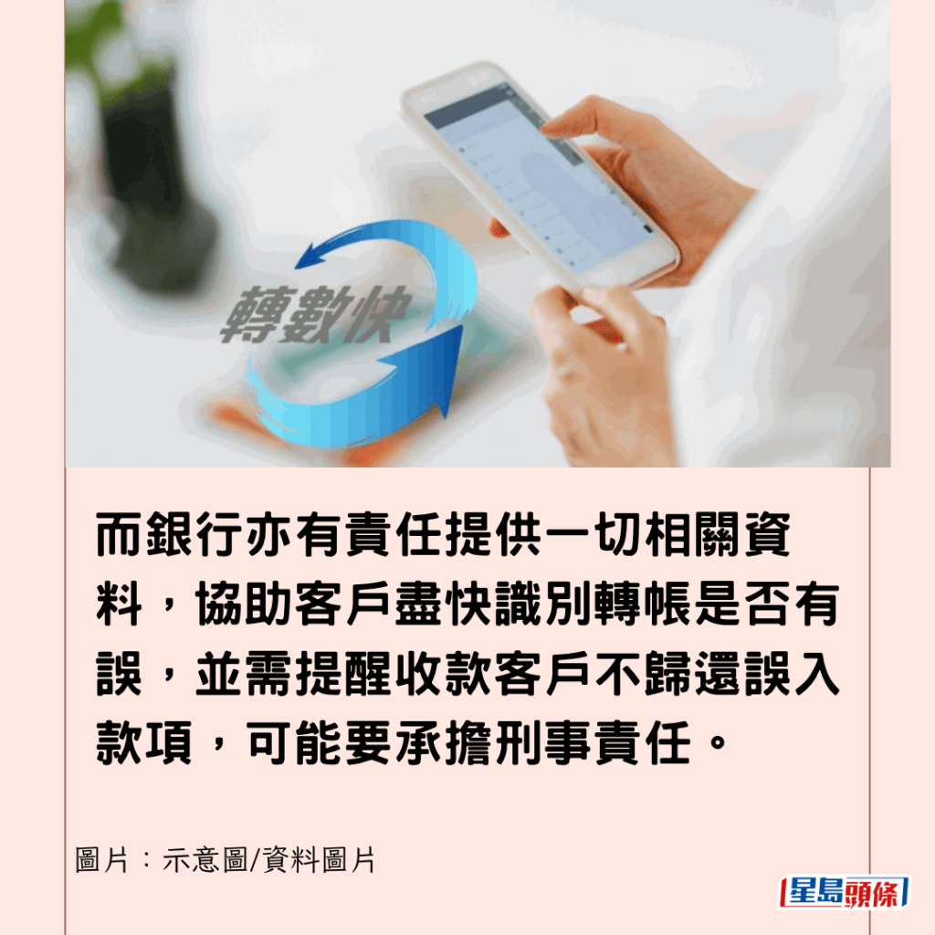 而銀行亦有責任提供一切相關資料,協助客戶盡快識別轉帳是否有誤,並需提醒收款客戶不歸還誤入款項,可能要承擔刑事責任。
