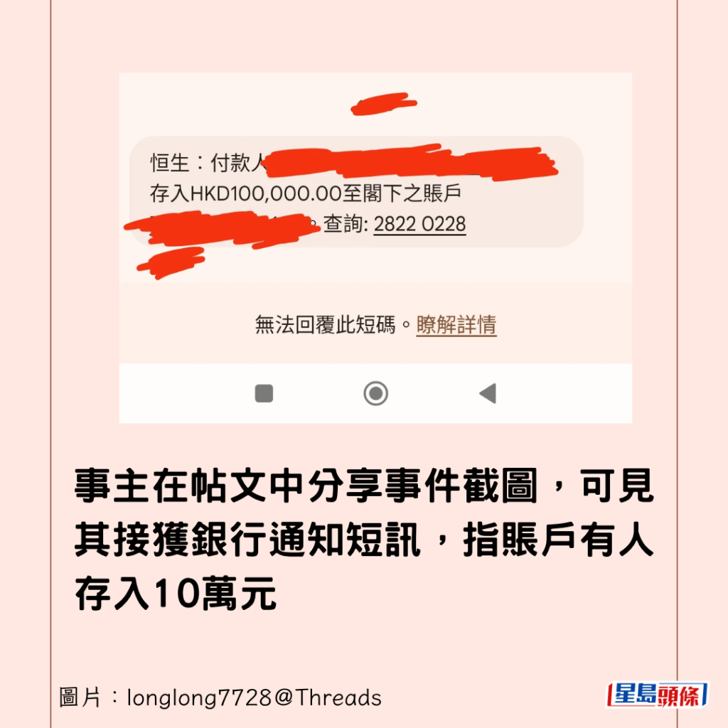 事主在帖文中分享事件截圖,可見其接獲銀行通知短訊,指賬戶有人存入10萬元,此外,該「入錯數」人士在Whatsapp中留言表示:「唔好意思,我啱啱轉錯數俾您,麻煩覆電話俾我。」