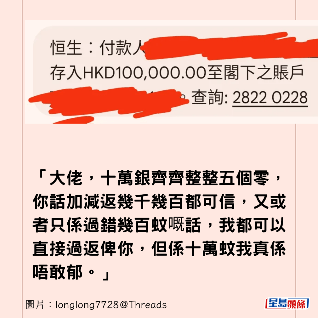 獲$100,000入賬 事主驚訝:「我啲朋友圈咁X基都冇五個0咁多」