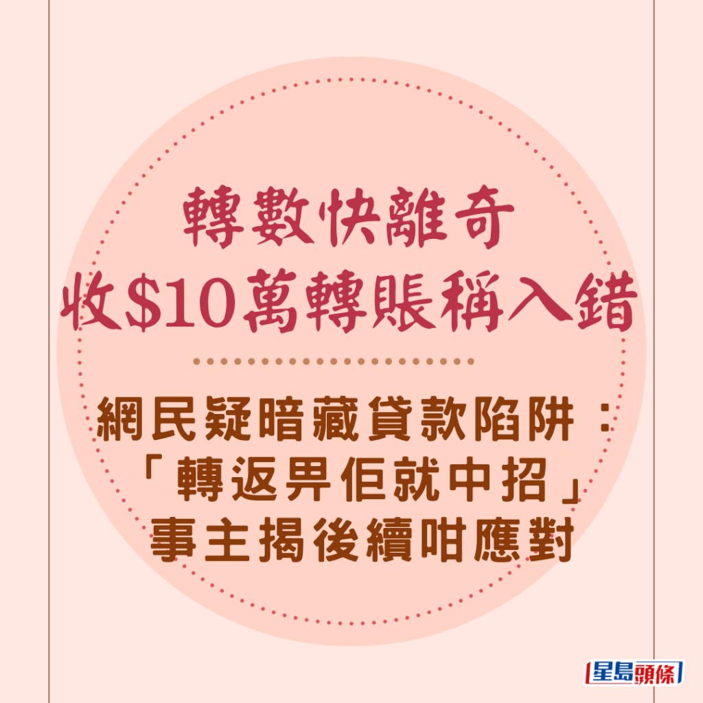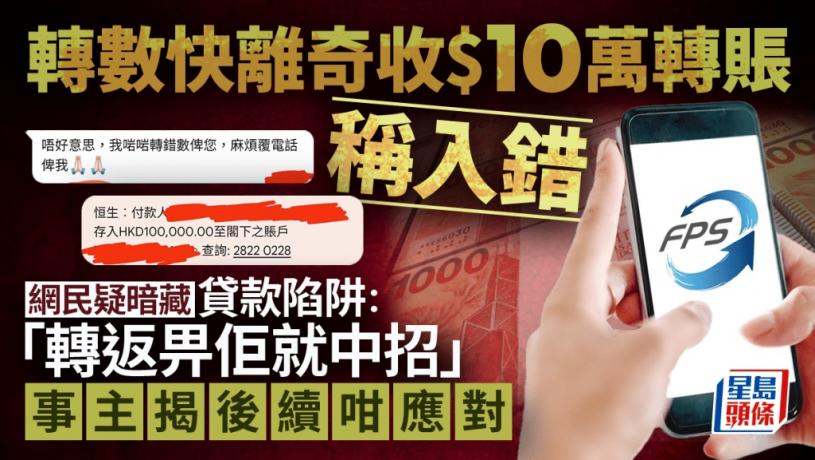 有網民昨日(22日)分享離奇遭遇,他指近日突然在轉數快收到高達10萬元的轉賬,未幾有人分別Whatsapp和致電給他,稱「過錯數」,此遭遇引發熱議,有網民懷疑暗藏貸款陷阱,提醒事主不要私下「轉返畀佢」,否則可能「中招」,事主則透露後續應對方法。