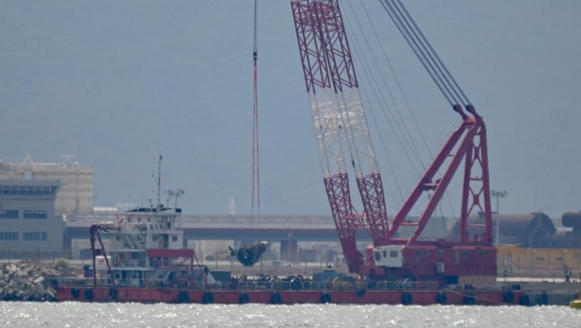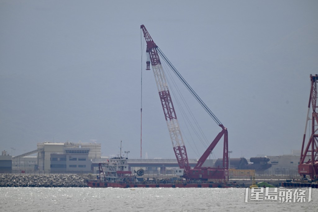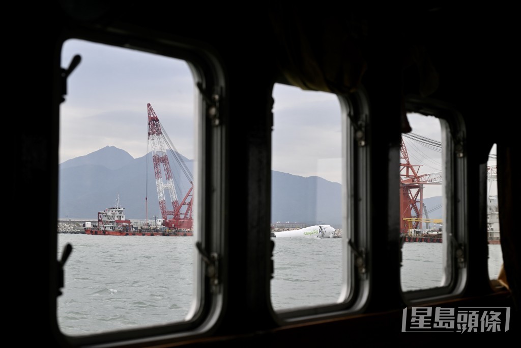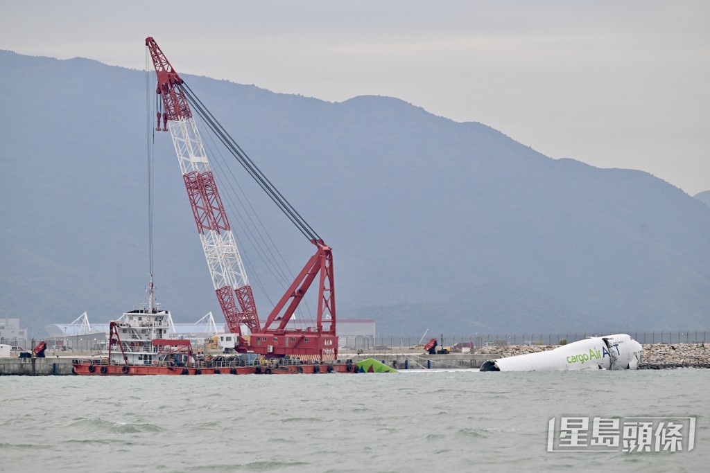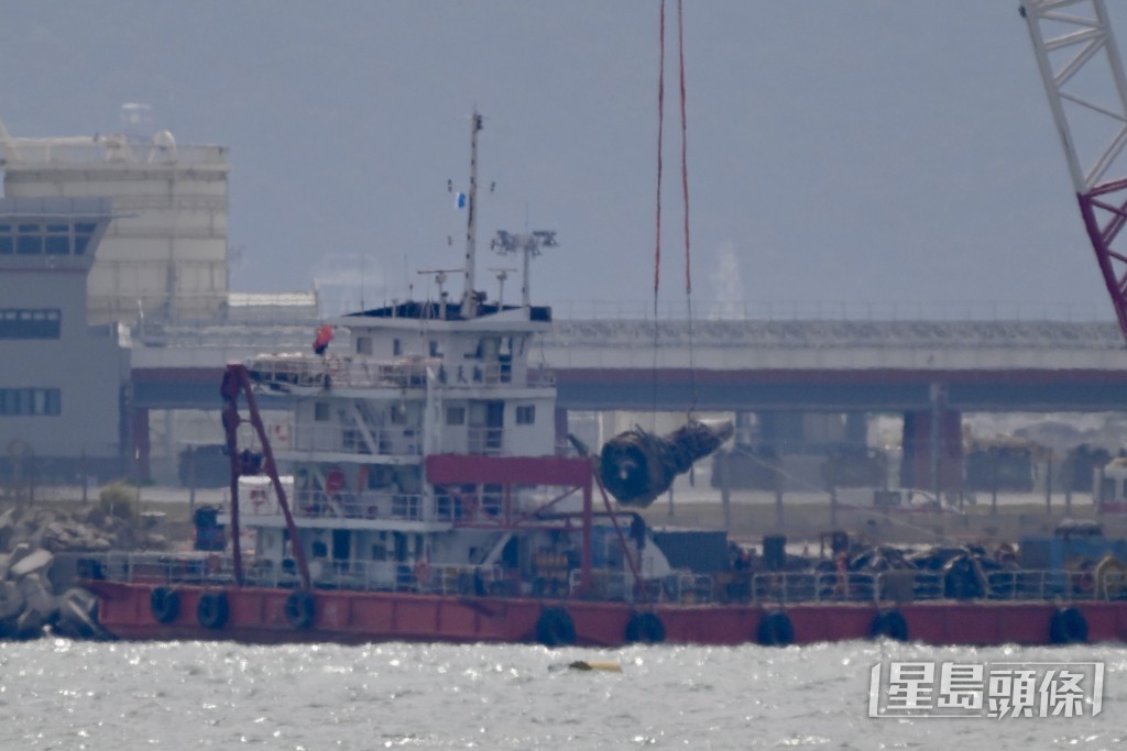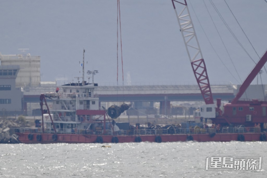 今晨《星島頭條網》記者出海觀察,發現打撈船「南天翔」及「南天鵬」、拖船「穗救拖18」均已在場,並駛近貨機殘骸,開始吊起疑引擎的機件。岸邊則有多名工作人員穿上反光衣戒備及監察。