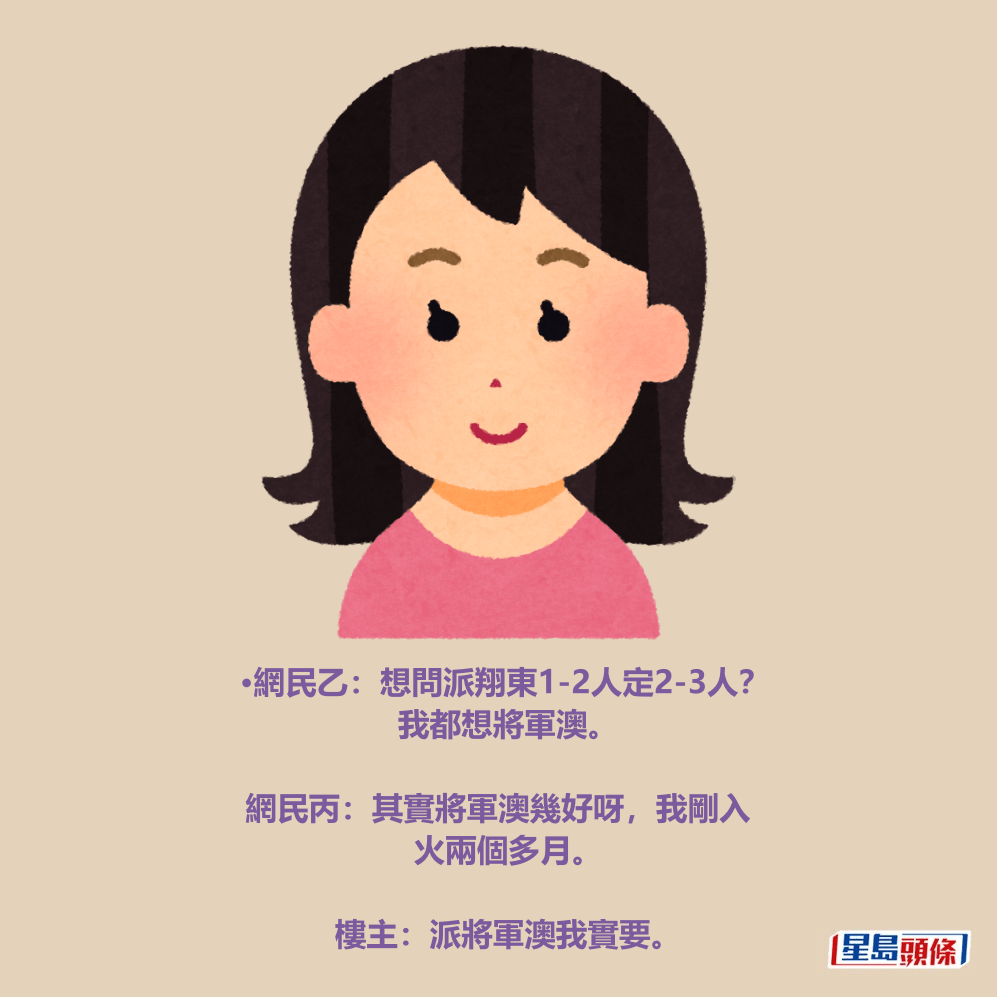 •網民乙:想問派翔東1-2人定2-3人?我都想將軍澳。