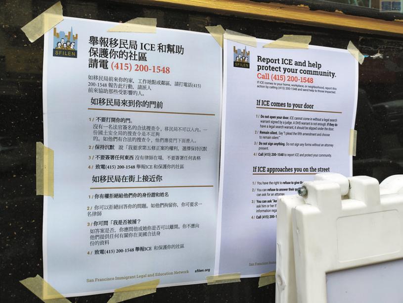 昨天(10月24日),由十多個法律與社區服務機構組成的三藩市移民法律與教育網絡(San Francisco Immigrant Legal & Education Network,簡稱SFILEN),在華埠大街小巷張貼該系列海報,呼籲居民保持警覺,互相通報ICE(移民及海關執法局)的突擊行動。