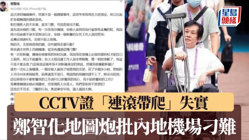 台灣殘障歌手鄭智化斥責深圳機場無人性事件,持續發酵。在登機閉路電視片段流出,鄭智化被質疑指控誇大失實後,鄭26日再發文,地圖炮式批評內地機場對殘疾人刁難不友善。隨著CCTV流出及鄭智化再度發文,網上民情開始逆轉。
