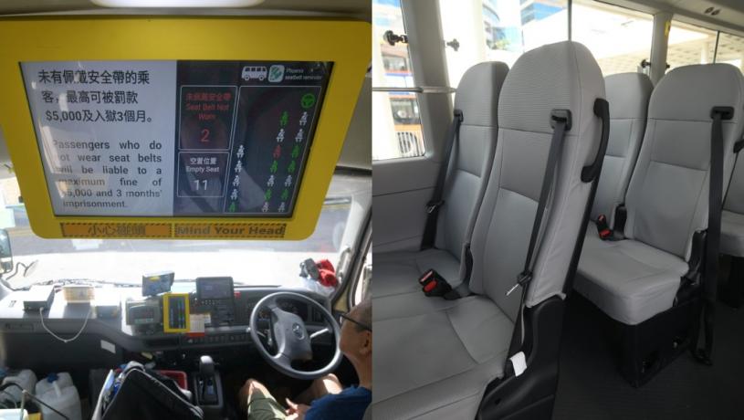 張漢華說,安全帶偵測警示系統會透過顏色(綠色代表已佩戴,紅色代表未佩戴)及聲響提示司機及乘客未扣上安全帶,認為有亮燈和聲響有效提醒乘客盡快扣好安全帶,以免違規被罰。他指目前全港有184部小巴已安裝此系統,但只佔不足5%,而全港仍有4100部未安裝,稱每部車安裝需花費2至3萬元,希望政府能資助業界安裝。