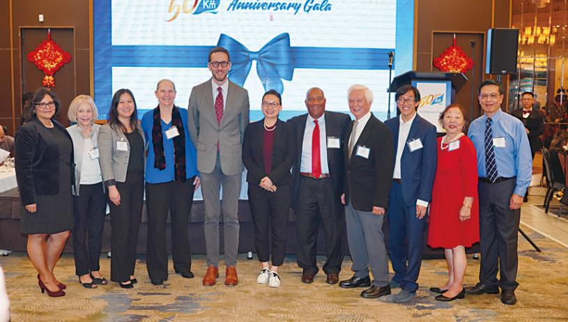啟明啟蒙總監楊承達(中央藍襯衫)、國會議員普洛西、三藩市幼兒教育局局長Ingrid X. Mezquita、戴維斯加大教授及大會主席Thomas Jue、校董會成員等在50周年慶祝會上合影。 記者黃偉江攝