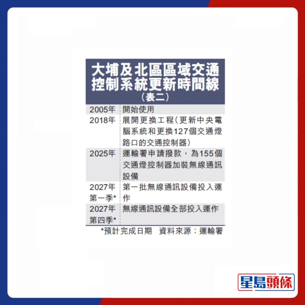 翻查資料,「大埔及北區區域交通控制系統」於2019年第二季完成更換工程(見表二),牽涉中央電腦系統、電訊設備、管理員控制台及127個交通燈路口的交通燈控制器。該系統主要協調分區內的交通燈運作,減少車輛在路口停車等候。今年初,運輸署向財務委員會申請撥款,用於購置及安裝無線通訊設備,進一步提升效能。