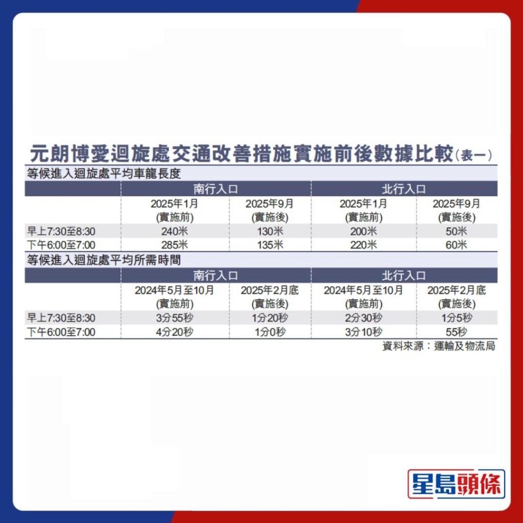 針對迴旋處的瓶頸問題,有上水居民建議,參考元朗博愛迴旋處的做法,加裝交通燈號系統,提升調節車流的能力。實際上,近年政府有多項針對迴旋處的交通改善工程,例如去年8月,將觀塘偉業街與開源道交界、有逾60年歷史的迴旋處,改劃為十字路口;今年2月,政府在元朗博愛迴旋處加設交通燈及擴闊凹頭方向出口,平衡各入口的車流,令車輛有序進出。根據立法會文件,相關措施實施後,車龍平均長度及等候時間均有減少(見表一)。