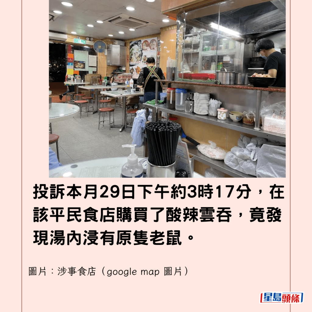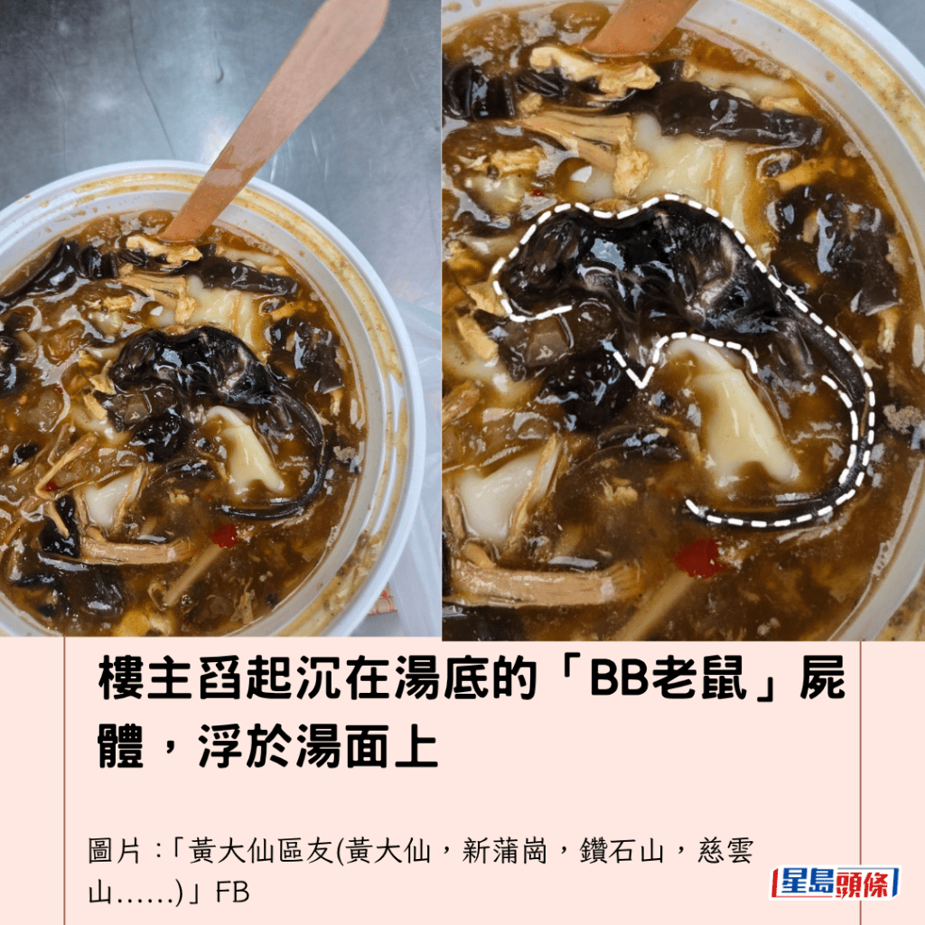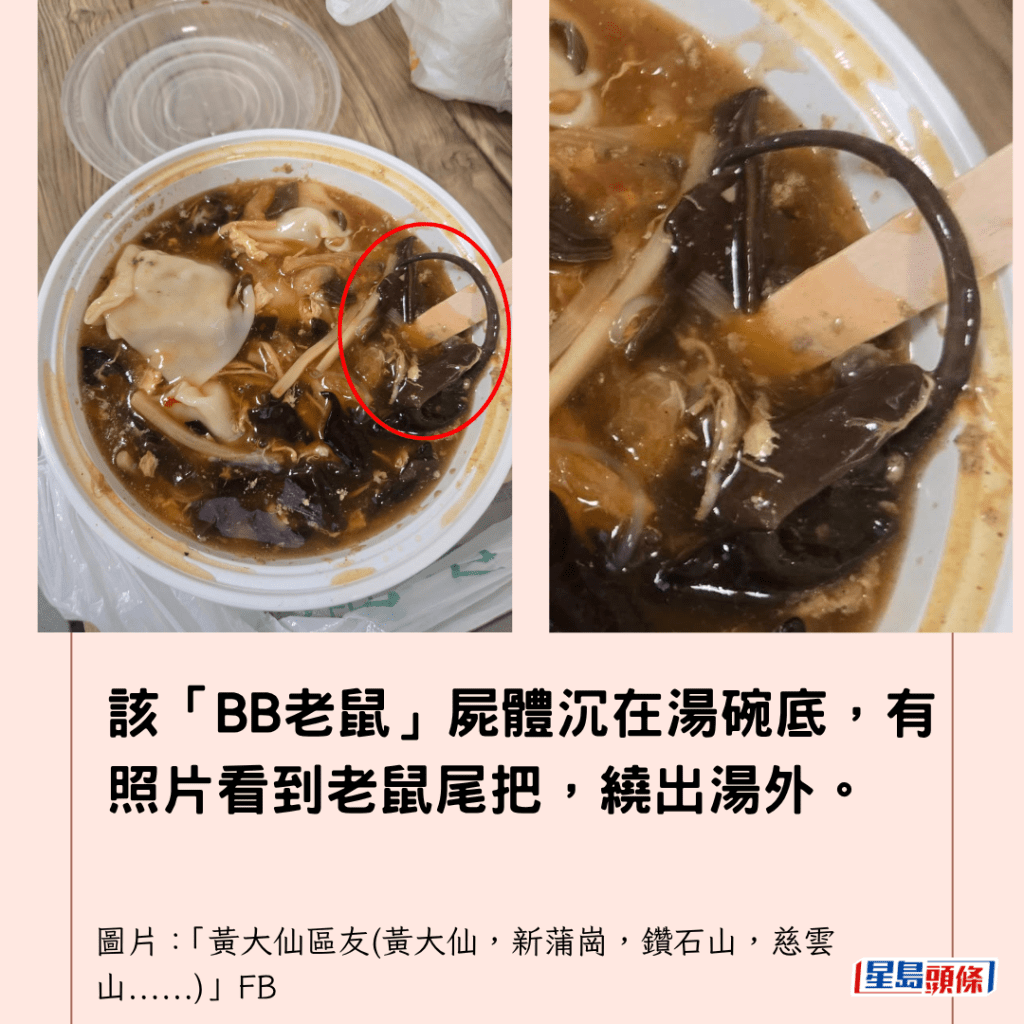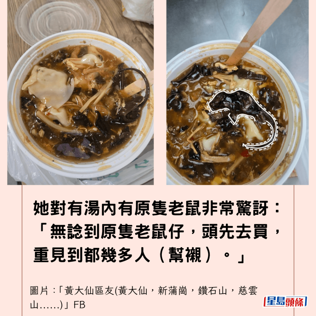 有網民昨日(29日)在「黃大仙區友(黃大仙,新蒲崗,鑽石山,慈雲山……)」FB專頁發相發帖,投訴昨下午約3時17分,在該平民食店購買了酸辣雲吞,竟發現湯內浸有原隻老鼠。