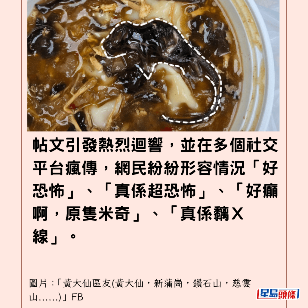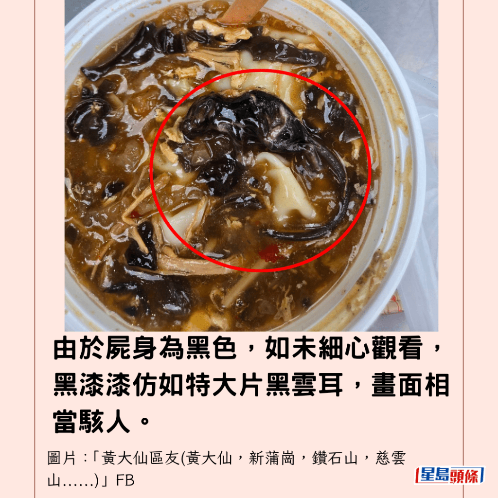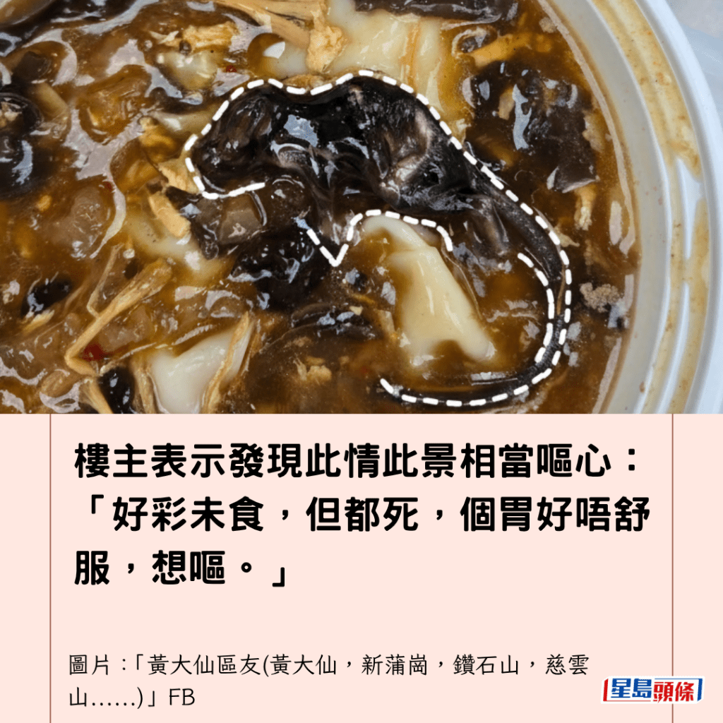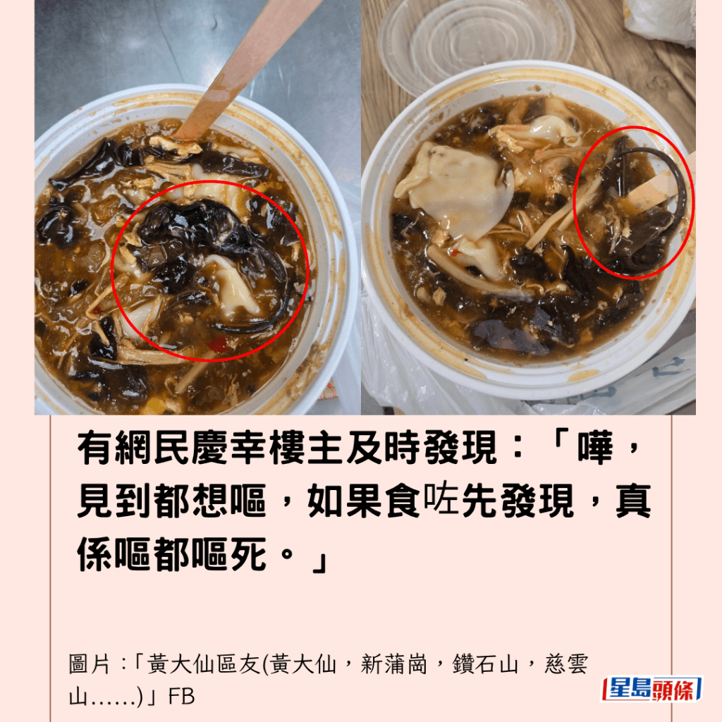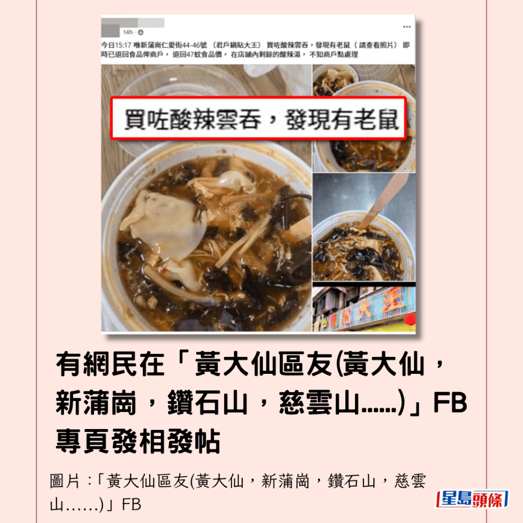 有網民昨日(29日)在「黃大仙區友(黃大仙,新蒲崗,鑽石山,慈雲山……)」FB專頁發相發帖,投訴昨下午約3時17分,在該平民食店購買了酸辣雲吞,竟發現湯內浸有原隻老鼠。