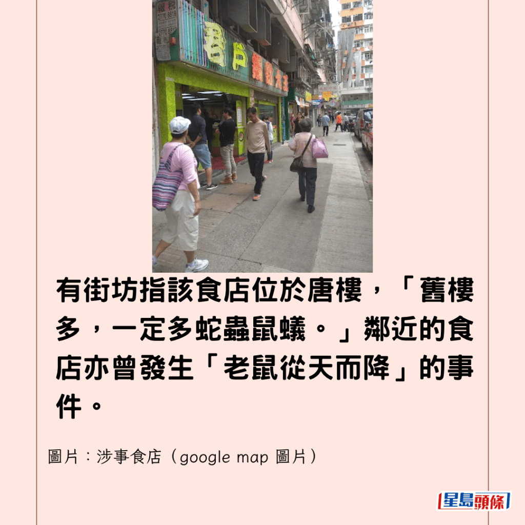 有街坊指該食店位於唐樓,「舊樓多,一定多蛇蟲鼠蟻。」鄰近的食店亦曾發生「老鼠從天而降」的事件。有街坊又分享早前在該店「試過酸辣湯飲到一半,發現有曱甴腳」,另有街坊亦憂慮該店衛生環境。
