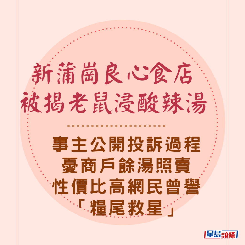 新蒲崗良心食店被揭老鼠浸酸辣湯 事主公開投訴過程憂商戶餘湯照賣 性價比高網民曾譽「糧尾救星」↓↓↓↓
