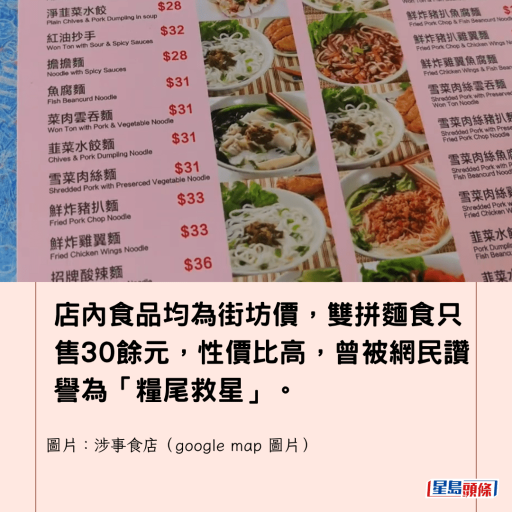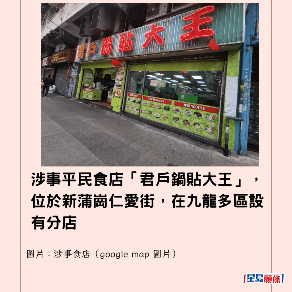 涉事平民食店「君戶鍋貼大王」,位於新蒲崗仁愛街,在九龍多區設有分店,店內食品均為街坊價,雙拼麵食只售30餘元,性價比高,曾被網民讚譽為「糧尾救星」。