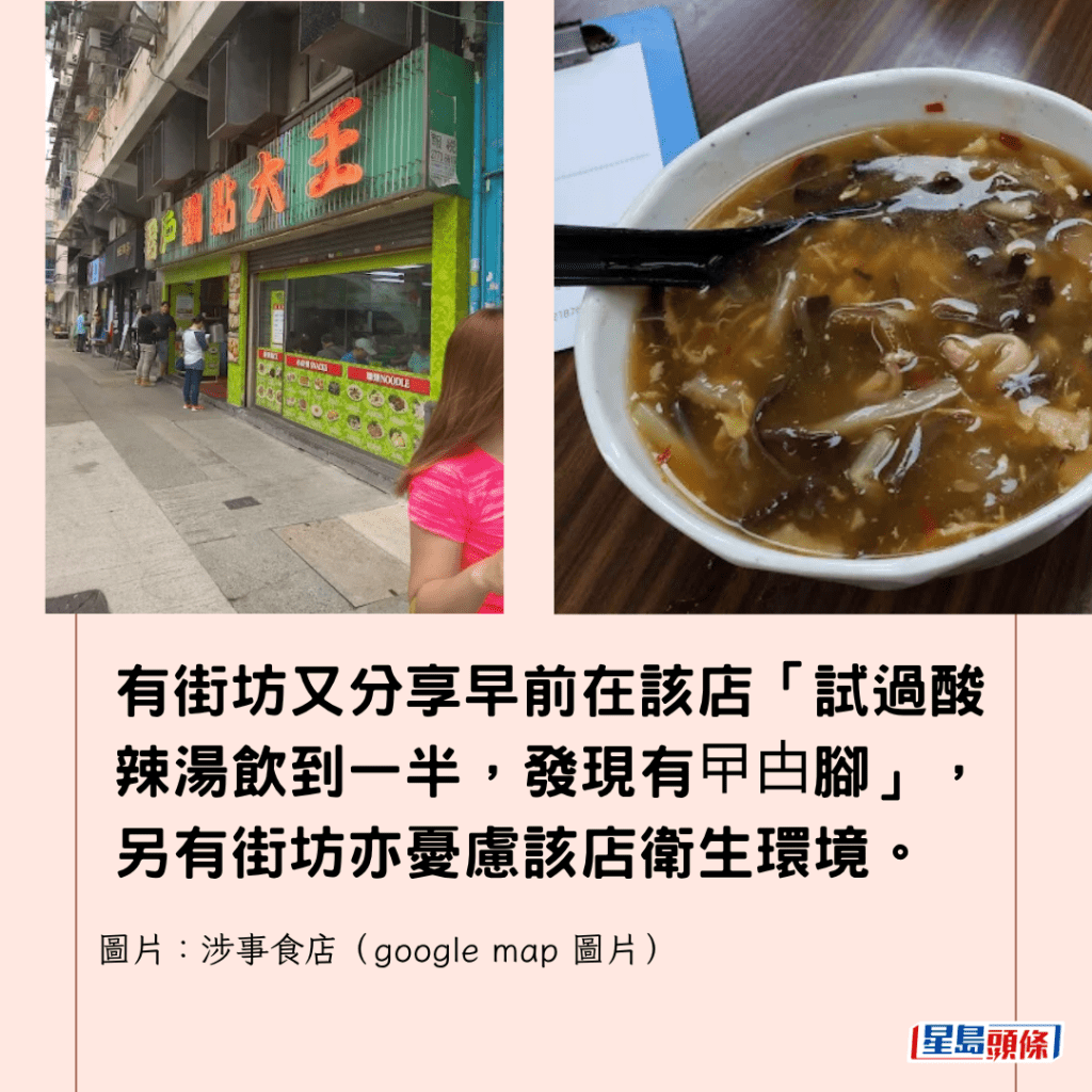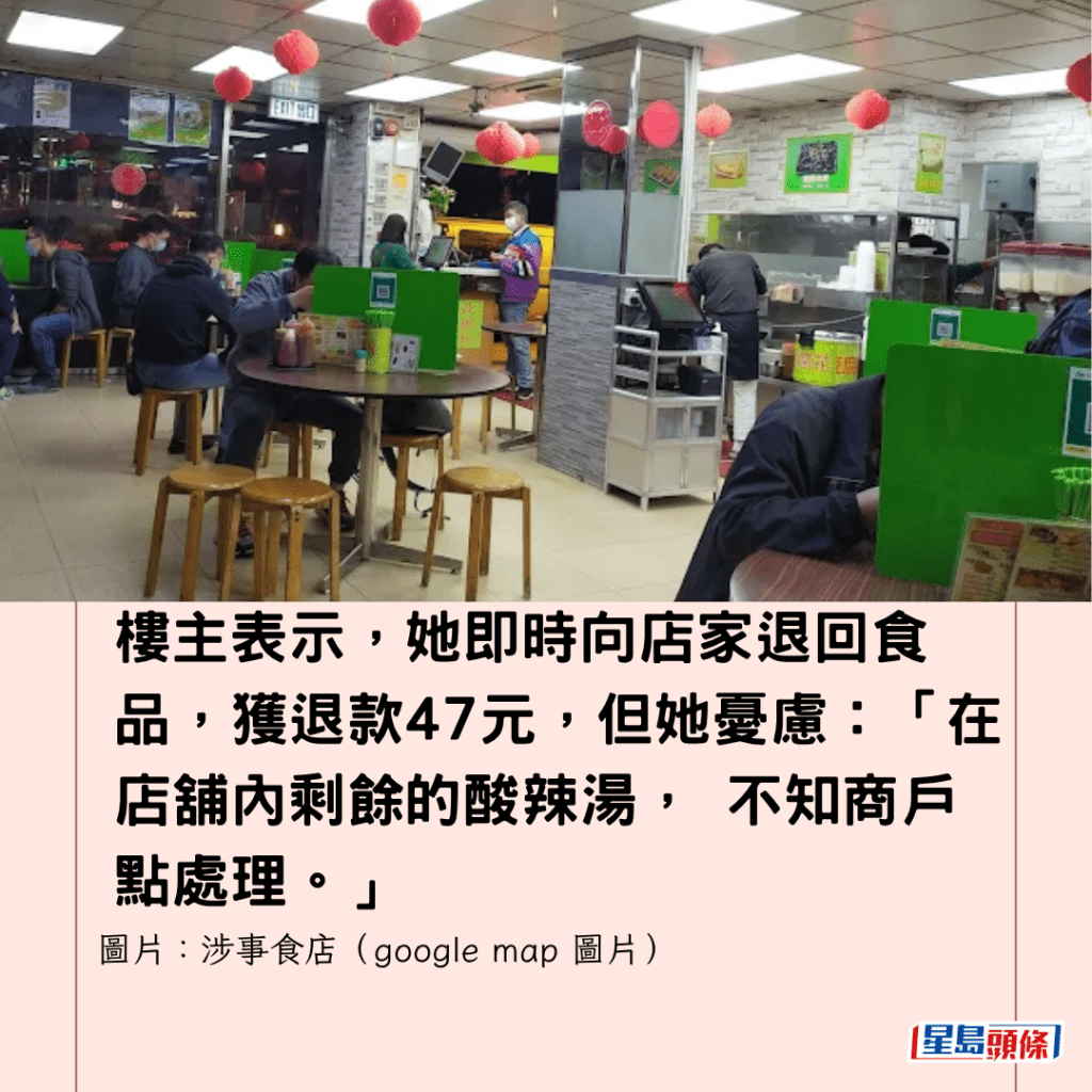 樓主表示,她即時向店家退回食品,獲退款47元,但她憂慮:「在店舖內剩餘的酸辣湯, 不知商戶點處理。」