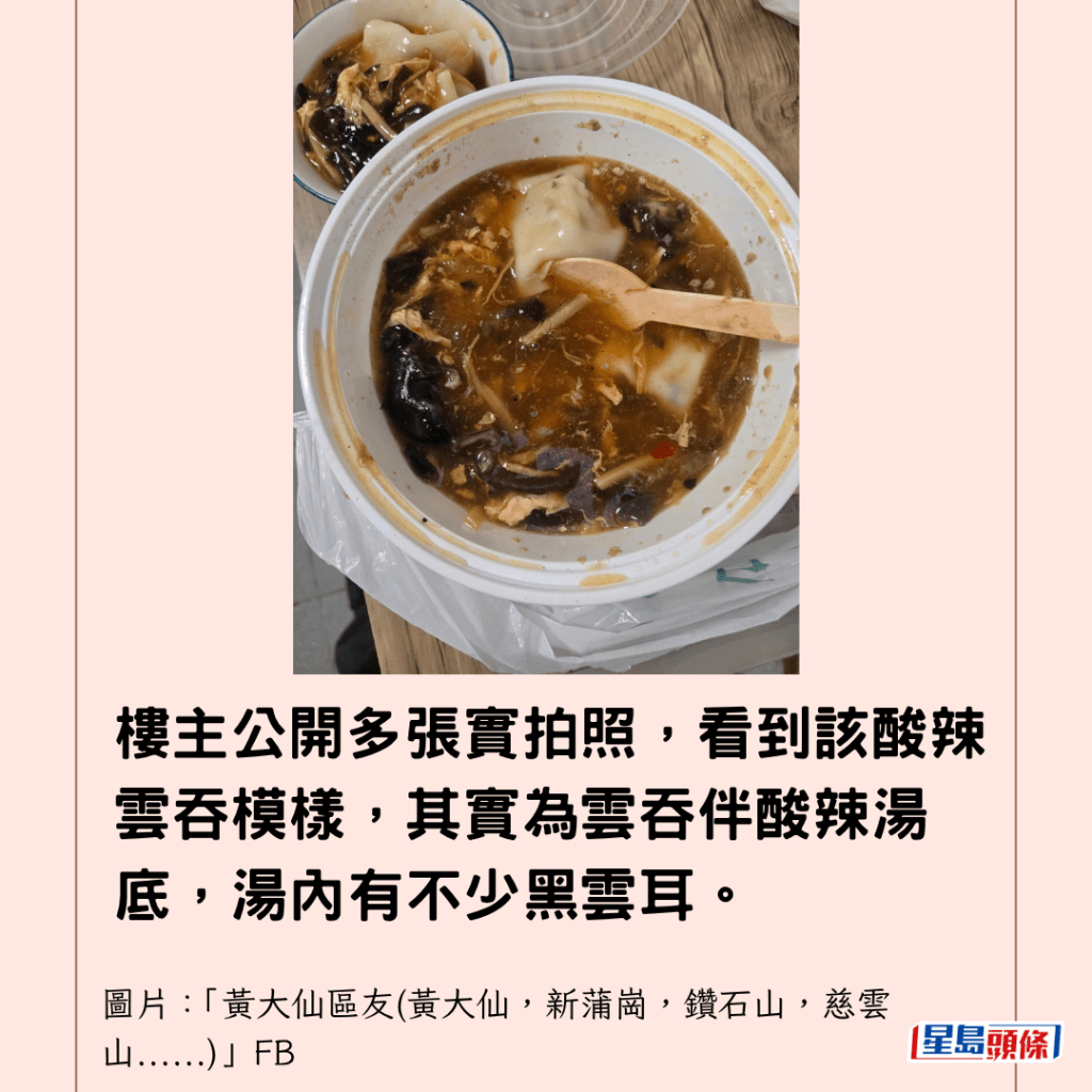 樓主公開多張實拍照,看到該酸辣雲吞模樣,其實為雲吞伴酸辣湯底,湯內有不少黑雲耳。