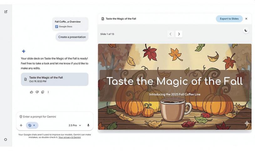 AI生成的簡報不僅只有文字內容,還附帶主題和圖片。用戶可以直接從Gemini應用程式匯出到谷歌簡報(Google Slides),並且仍可根據需要編輯和潤飾簡報,或與團隊成員協作完成。此功能現已開放給個人帳號和Workspace帳號。