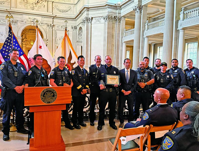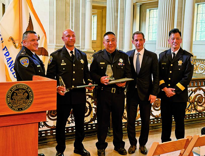三藩市警察局昨日在市政廳舉行本年度第三季「月度警官獎」頒獎典禮,由市長羅偉與警察局臨時局長葉培恩共同主持,表彰六位在維護公共安全、打擊犯罪及推動社區教育方面表現傑出的警員。活動由警察局高級分析師梁林靜宇籌劃,獲多家企業贊助支持。
