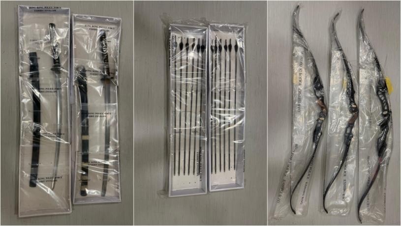 警方國安處日前拘捕5名男女,涉嫌在2019年反修例事件中,為示威者製造及提供武器。國安處又於昨午(10月29日)突擊搜查九龍一單位,檢獲3把複合弓連同12支箭,以及2把武士刀,並拘捕一名46歲男子,他涉嫌違反「管有攻擊性武器並有所意圖」罪,正被扣留調查。警方不排除有進一步拘捕行動。