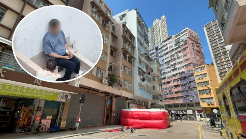 今日(31日)中午12時14分,警方接獲報案,指一名男子在大角咀槐樹街21-25號健理樓的六樓天台徘徊,未幾更危坐天台邊,狀甚危險。消防接報到場並展開救生氣墊戒備,警方亦到場與消防向事主展開游說,
