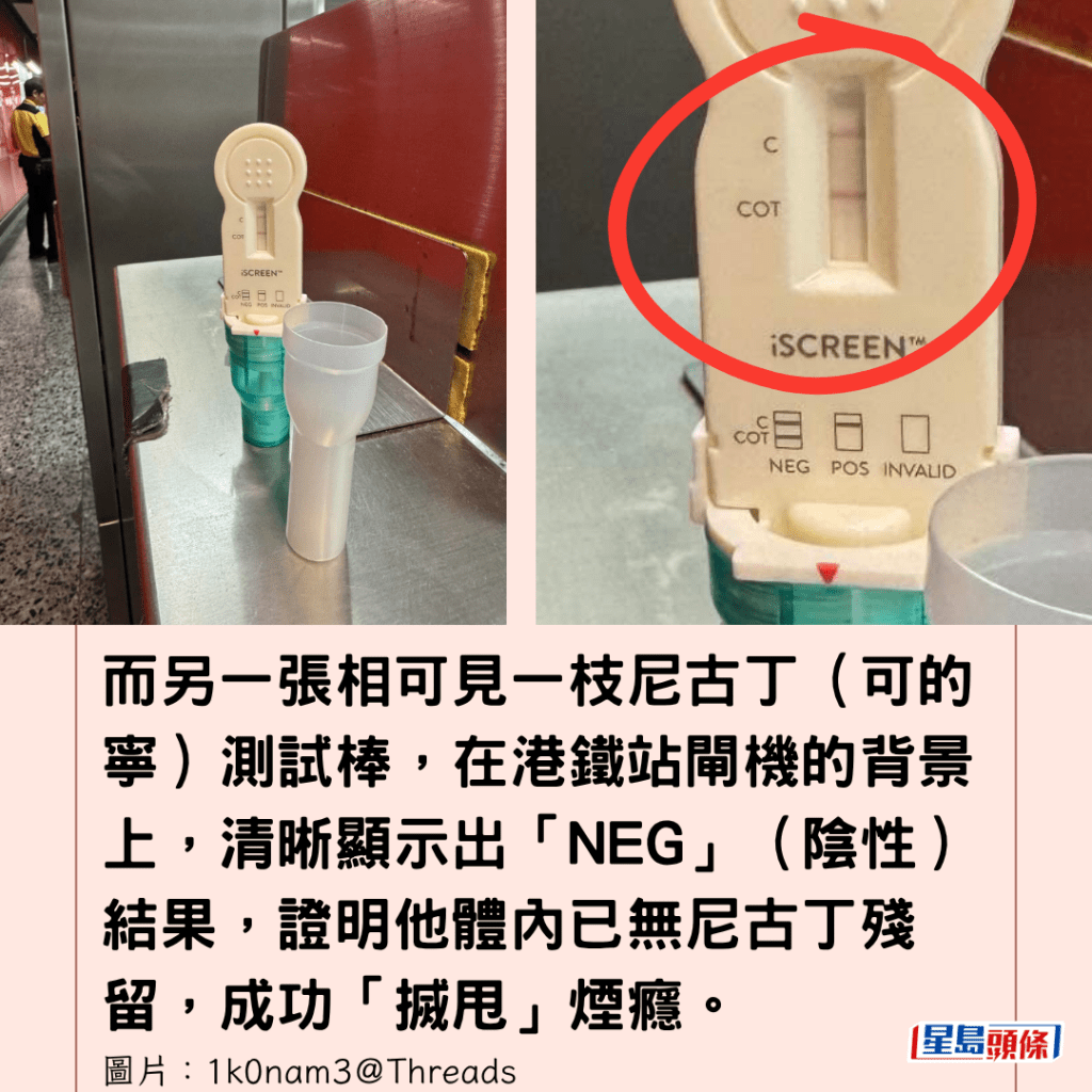 而另一張相可見一枝尼古丁(可的寧)測試棒,在港鐵站閘機的背景上,清晰顯示出「NEG」(陰性)結果,證明他體內已無尼古丁殘留,成功「搣甩」煙癮。