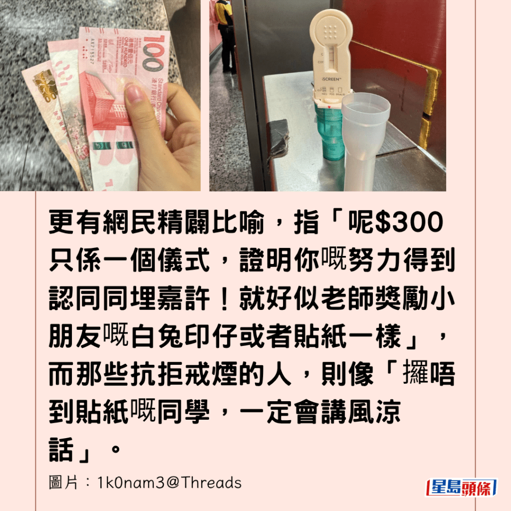 更有網民精闢比喻,指「呢$300只係一個儀式,證明你嘅努力得到認同同埋嘉許!就好似老師獎勵小朋友嘅白兔印仔或者貼紙一樣」,而那些抗拒戒煙的人,則像「攞唔到貼紙嘅同學,一定會講風涼話」。
