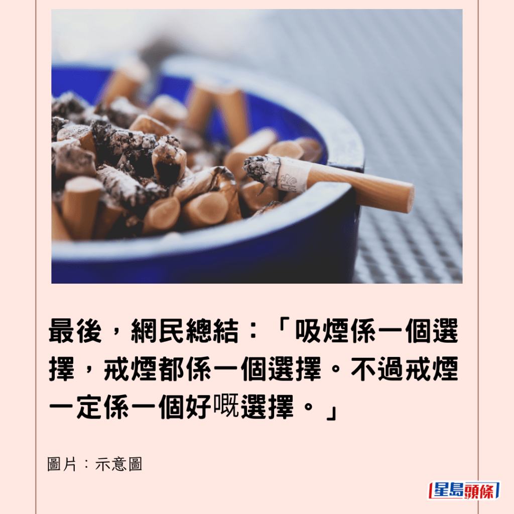 最後,網民總結:「吸煙係一個選擇,戒煙都係一個選擇。不過戒煙一定係一個好嘅選擇。」