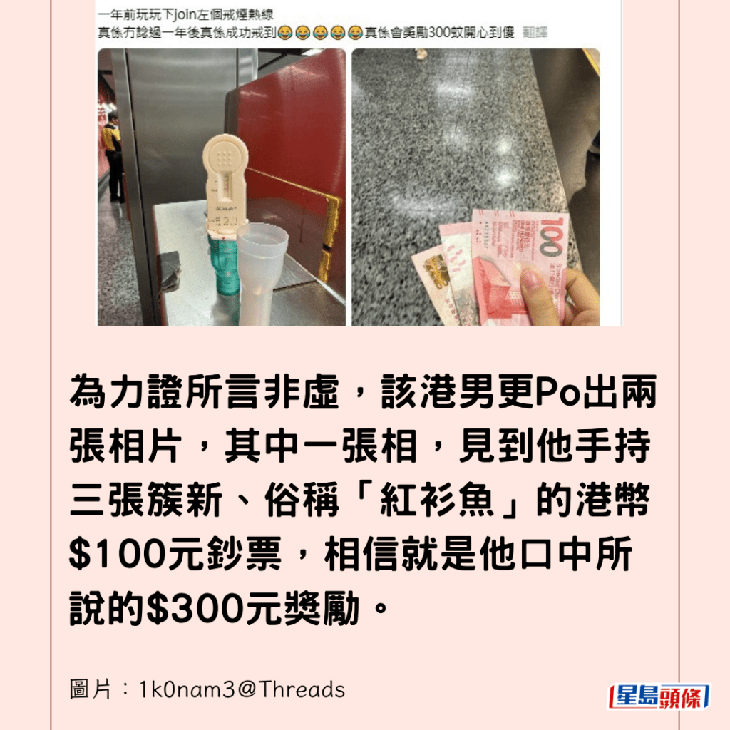 為力證所言非虛,該港男更Po出兩張相片,其中一張相,見到他手持三張簇新、俗稱「紅衫魚」的港幣$100元鈔票,相信就是他口中所說的$300元獎勵。