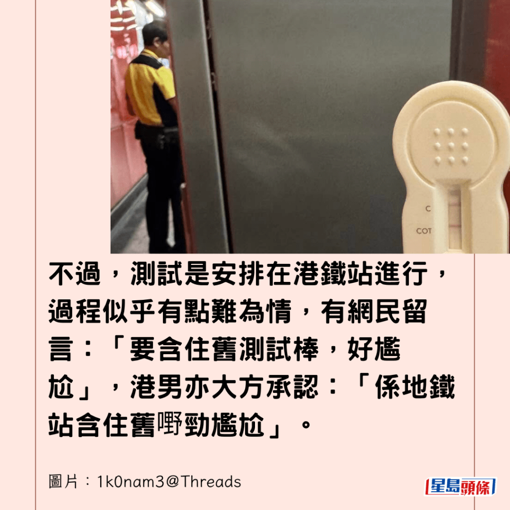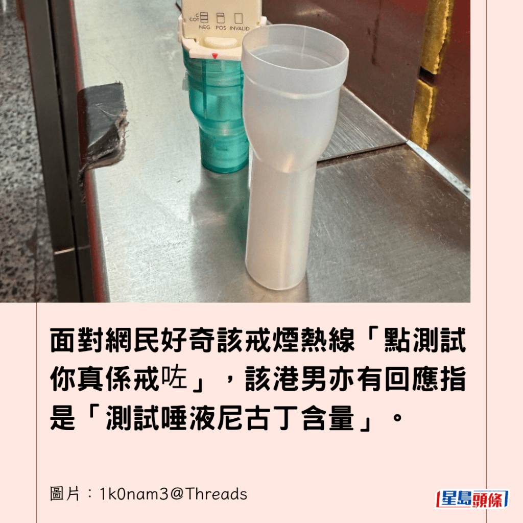 面對網民好奇該戒煙熱線「點測試你真係戒咗」,該港男亦有回應指是「測試唾液尼古丁含量」。不過,測試是安排在港鐵站進行,過程似乎有點難為情,有網民留言:「要含住舊測試棒,好尷尬」,港男亦大方承認:「係地鐵站含住舊嘢勁尷尬」。