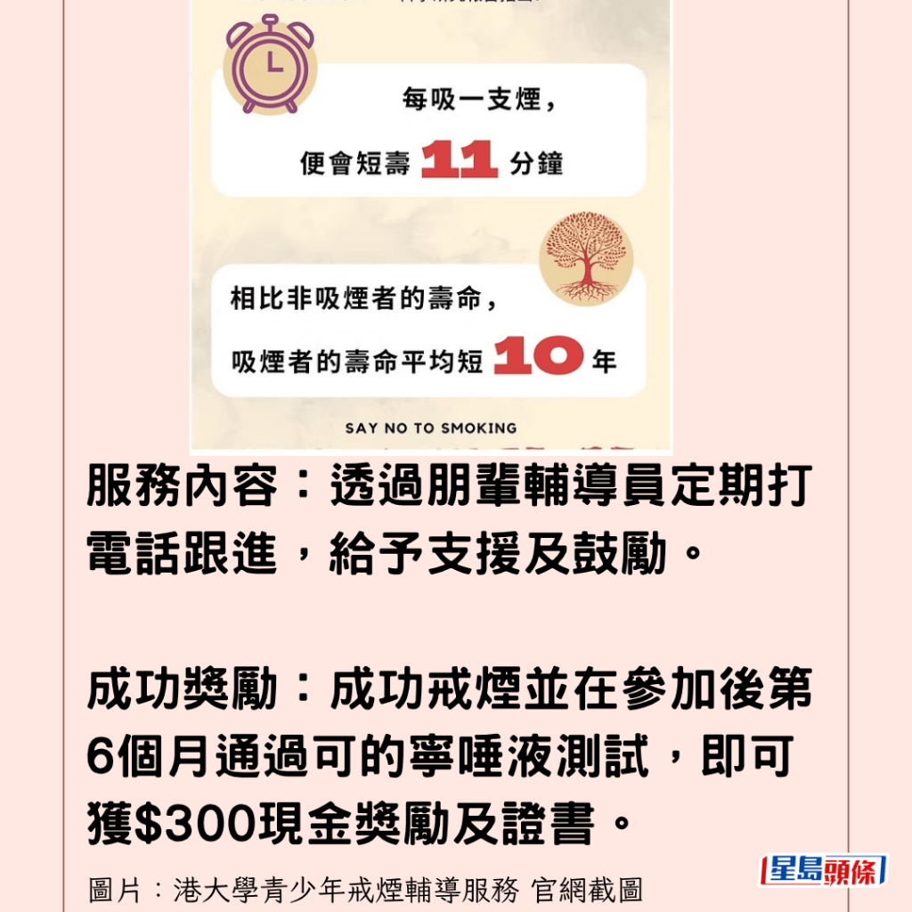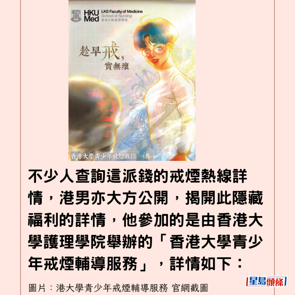 不少人查詢這派錢的戒煙熱線詳情,港男亦大方公開,揭開此隱藏福利的詳情,他參加的是由香港大學護理學院舉辦的「香港大學青少年戒煙輔導服務」,詳情如下: