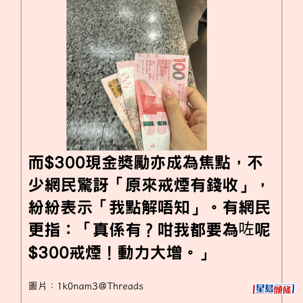 而$300現金獎勵亦成為焦點,不少網民驚訝「原來戒煙有錢收」,紛紛表示「我點解唔知」。有網民更指:「真係有?咁我都要為咗呢$300戒煙!動力大增。」