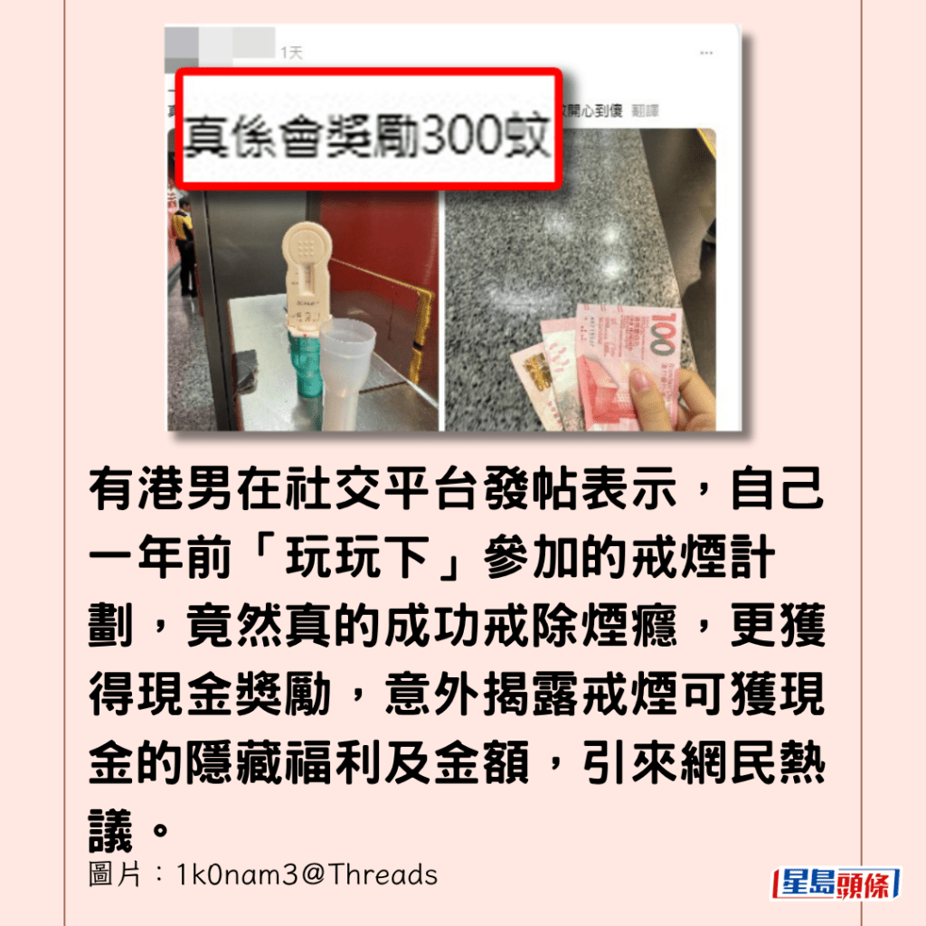 有港男在社交平台發帖表示,自己一年前「玩玩下」參加的戒煙計劃,竟然真的成功戒除煙癮,更獲得現金獎勵,意外揭露戒煙可獲現金的隱藏福利及金額,引來網民熱議。