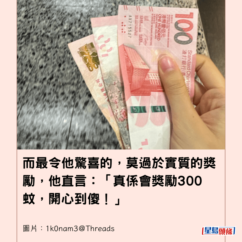 而最令他驚喜的,莫過於實質的獎勵,他直言:「真係會獎勵300蚊,開心到傻!」